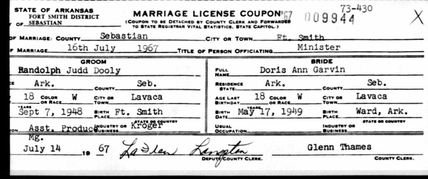 Toliver Dooly. July 16, 1967 he married Doris Ann Garvin in