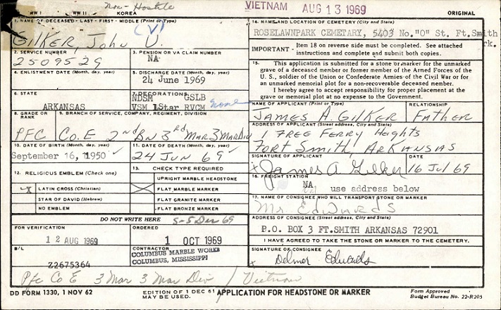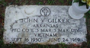Pfc John Victor Gilker was born Sept 16, 1950 to James A. and Phyllis Tuth Prebost Gilker, and died June 24, 1969