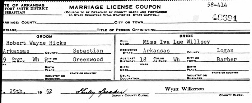 In 1952 he married Iva Lue Willsey from Barber, Logan