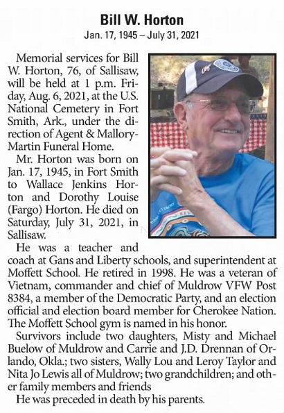 William "Bill" Wallace Horton passed away July 31, 2021 in Sallisaw, Sequoyah Co. Oklahoma. His