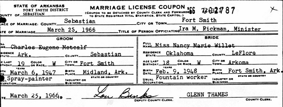March 25, 1966 he married Nancy Marie Willet at Fort Smith,