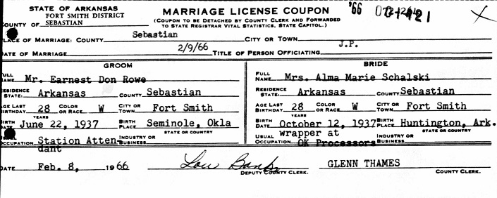 married Alma Marie Schalski in Sebastian Co., Ar. His spouse at the time of