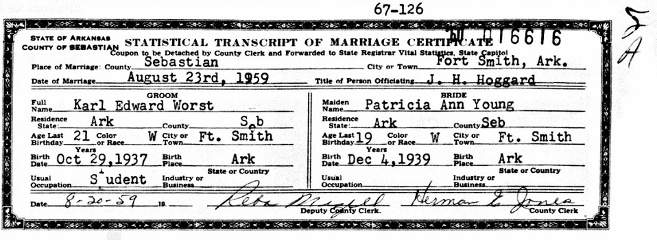 Ferdinand Lewis and Loile Hefley Worst of Fort Smith, Ar. His wife was Patricia Ann Young