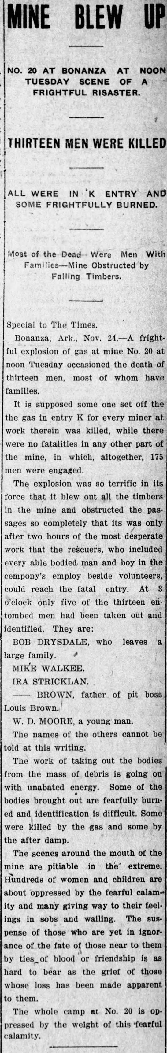 Fort Smith, Ark., Nov. 25. -- Thirteen miners were killed and great damage was done by an accidental explosion of gas in coal mine No. 20,