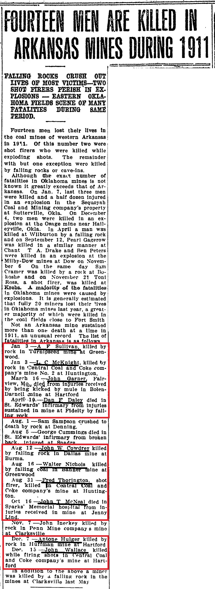 Miners Killed in 1911