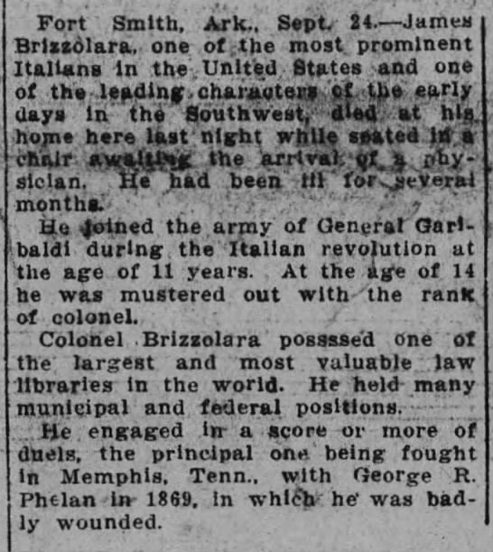 During the civil war and immediately after it's close, Brizzolara engaged in a score or more of duels, the principal one being fought in 1869, with George R. Phelan in Memphis. In this encounter he was badly wounded.