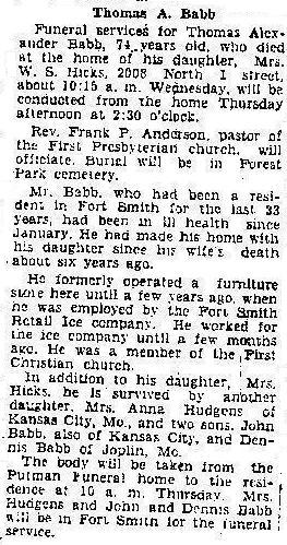 Funeral services for Thomas Alexander Babb, 74 years old, who died at the home of his daughter, Mrs. W.S. Hicks, 2008 No. "I" street, about 10:15 a.m. Wednesday, will be conducted from the home Thursday afternoon at 2:30 o'clock. Rev. Frank P. Anderson, pastor of the First Presbyterian church, will officiate. Bural will be in Forest Park cemetery. Mr. Babb, who had been a resident in Fort Smith for the last 33 years, had been in ill health since January. He had made his home with his daughter since his wife's death about six years ago. He formerly operated a furniture store here until a few years ago, when he was employed by the Fort Smith Retail ice company. He worked for the ice company until a few months ago. He was a member of the First Christian church. In addition to his daughter, Mrs. Hicks, he is survived by another daughter, Mrs. Anna Hudgens of Kansas City, Mo., and two sons, John Babb, also of Kansas City, and Dennis Babb of Joplin, Mo. The body will be taken from the Putman Funeral home to the residence at 10 a.m. Thursday. Mrs. Hudgens and John and Dennis Babb will be in Fort Smith for the funeral service. |