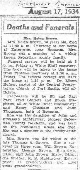 Mrs. Helen Brown, 78 years old, died at 11:40 a. m., Thursday at her home at Enterprise, near Bonanza. Mrs. Brown was a member of a widely known Sebastian county family.