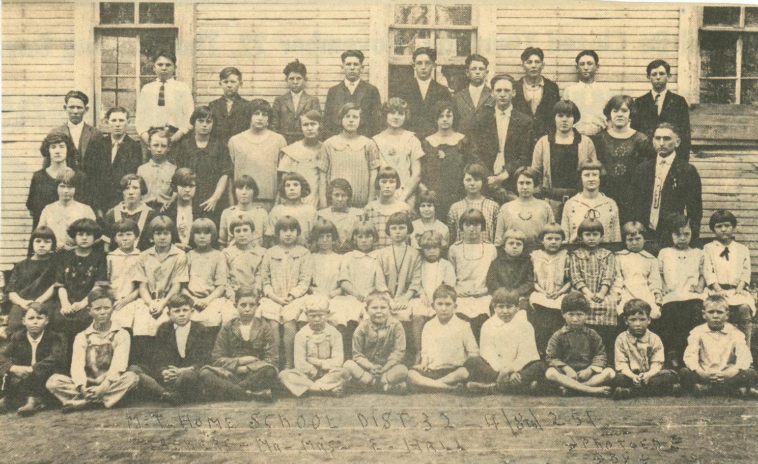 Fourth Row: - Mrs. Earnest Hall (teacher) ... Ross Bassinger ... Laycine Evans ... Ollie Martin ... Celesta Clark ... Losis Glen ... Tilda Martin ...