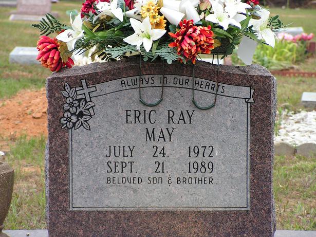 | May, Eric Ray | 24 Jul 1972- 21 Sep 1989 | s/o Shelby & Artista May, grandson of Dallas & Gladys May, great-grandson of Joseph Henry May. | ![]() | Jo Kilburn |