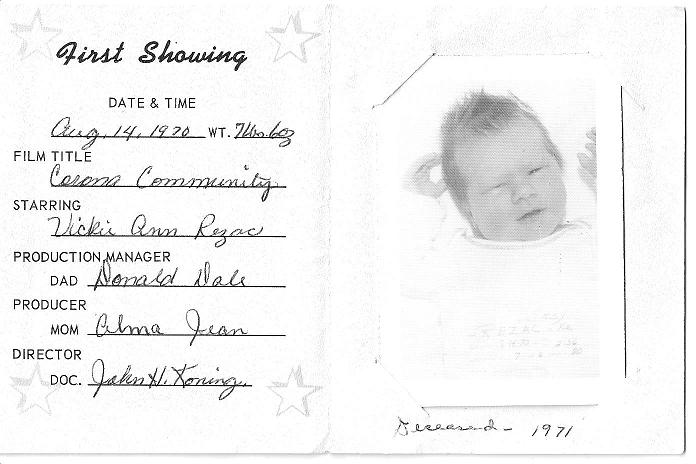 | Rezac, Vickie Ann | 8 Aug 1970- 17 Mar 1971 | d/o Alma Gene May-Davidson, granddaughter of Dallas & Gladys May, great-granddaughter of Joseph Henry May. | ![]() | Jo Kilburn |