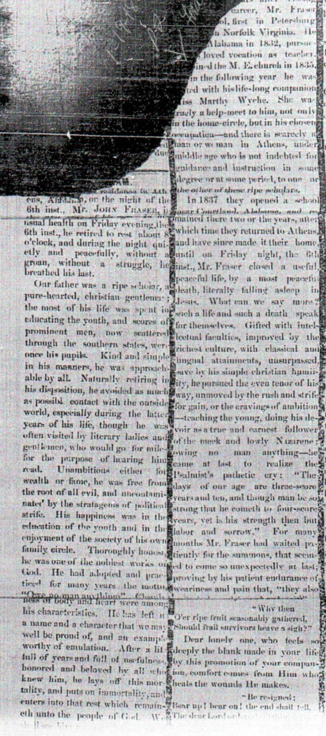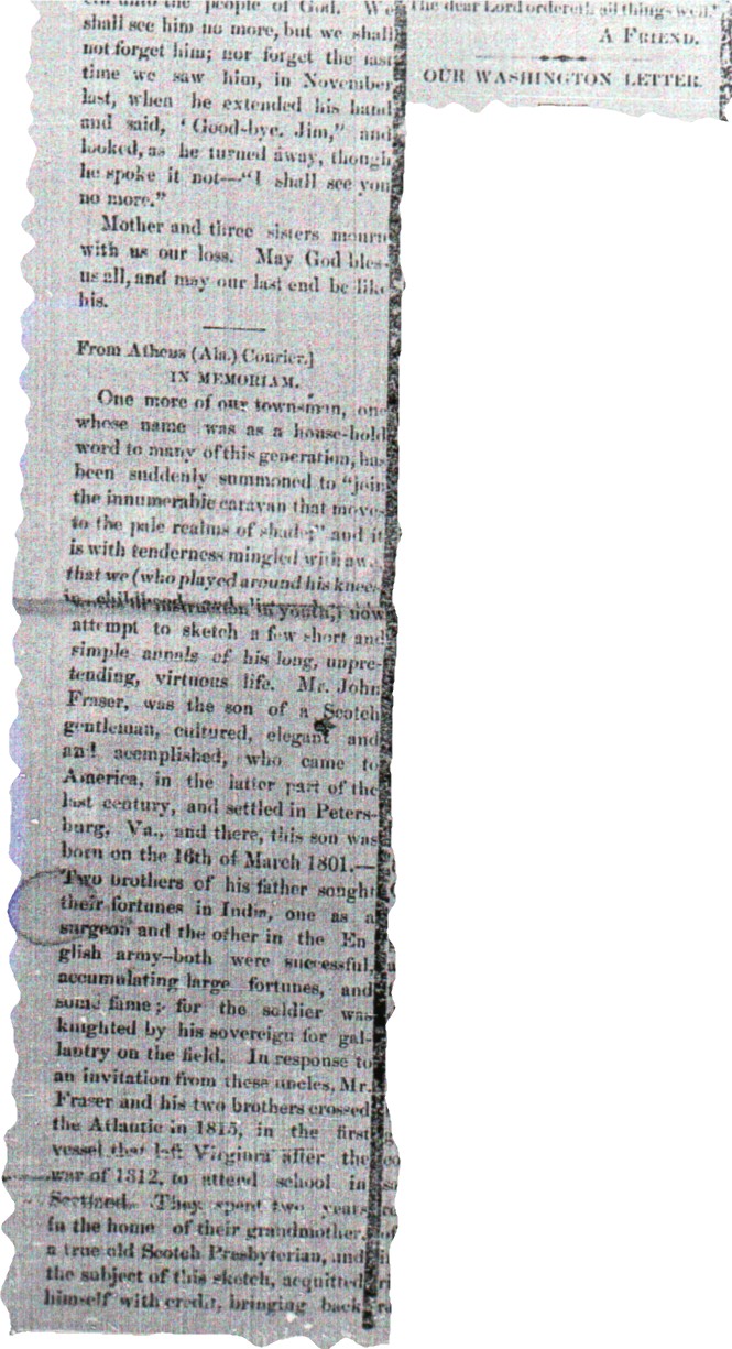 We were sorry, indeed, to learn by a letter received from the editor of this appear, Capt. Jas. H. Fraser, dated Little Rock, 2nd inst., of the death of his mother, which said event occurred at her home in Athens, Ala., on the 22nd. We extend our sympathy.