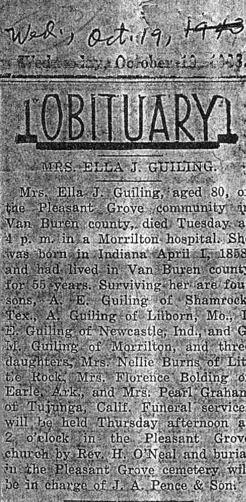 Funeral services were held December 6, at their home at Formosa with Rev. S. O. Jones of Clinton in charge of the services. Burial was at Culpepper Mountain by North Arkansas Funeral Home.