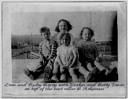 | Berry and Jones children sitting on the cellar door. Grandpa said, the first thing you did when you got a piece of property in Arkansas, was to dig the root cellar. If a tornado came your way, you'd be wanting that. --Submitted by Beverly Berry | |