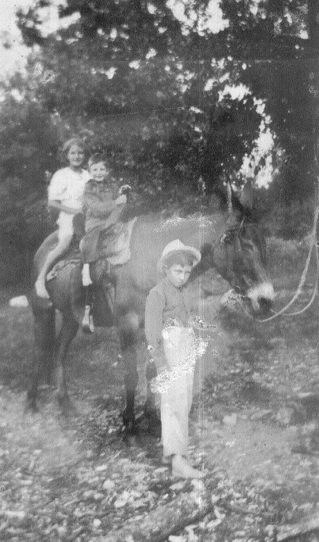 | Charlie, Jessie & Bessie Gardner - Bessie and Charlie on the mule Topper with Jessie standing was taken on Halfmoon Mountain in Van Buren County, Arkansas. That is when Thomas (Tom) Gardner cut and hauled White Oak Staves to Leslie to the Stave Mill for making Whiskey Barrels. --Submitted by Murlene Gardner Horlacher | |