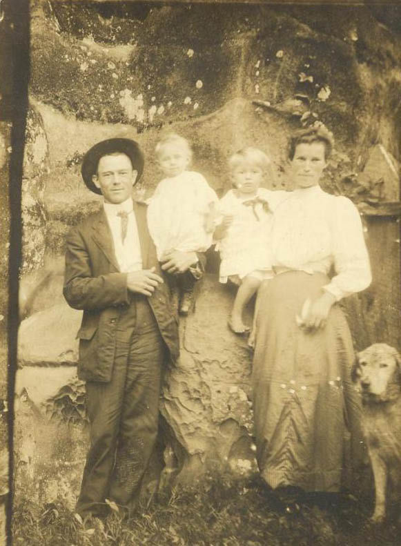 | Claude S. Elliott & Susan Etta Robertson Elliott and 2 sons, William (right) & Wilmer (left). This was taken at Indian Rock Cave. Indian Rock Cave was a popular spot for church gatherings (etc) in Van Buren County. Now it is a cave in Fairfield Bay golf course. There are many initials carved in it over the years. Claude is the son of William Monroe Elliott and Elizabeth Jane Brown Elliott. Original owner of this picture was Lloyd Eoff. --submitted by Linda Maxey Prater | |