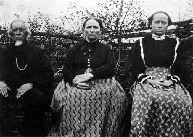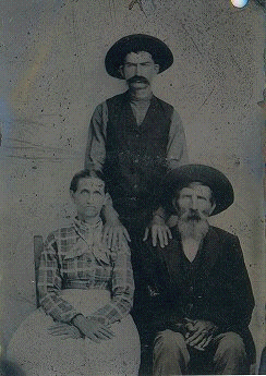 | A tin type picture of my great grandfather - James Richard Maxey (standing) his mother - Nancy Jane Holder Maxey Sullivan and his step father Daniel Sullivan. Each are buried in Rushing Cemetery in Stone Co - just across the Van Buren Co line.--submitted by Linda Maxey Prater | |