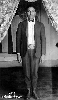 | John Tully - Husband of Mary Ann Berry. We assume that John borrowed this suit from a much shorter man. John was over six feet tall, had black hair and pure black eyes. His g.g.grandaughter looks very, very much like him. John died in 1897. He is buried beside Mary Ann's grave with a headstone that simply says, John. His cause of death is unknown. --Submitted by Beverly Berry | |