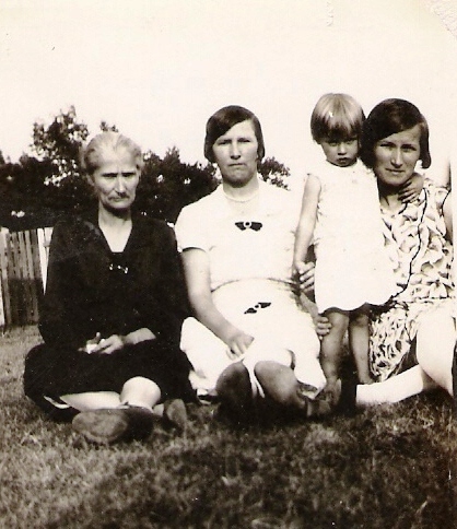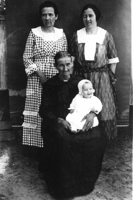 | This is a picture of my Great grandmother Nancy Beth (I do not know what her last name was) she was born in 1852 and married James Winffield Beavers. She is holding Inez Guiling, the fourth generation. Behind her in the checked dress is my Grandmother Elizabeth B Beavers. Elizabeth married John Logan McCoy 23 Mar. 1897. Beside of Grandmother is my Mother Zora Faye (McCoy) Guiling. --Submitted by Norman Guiling | |