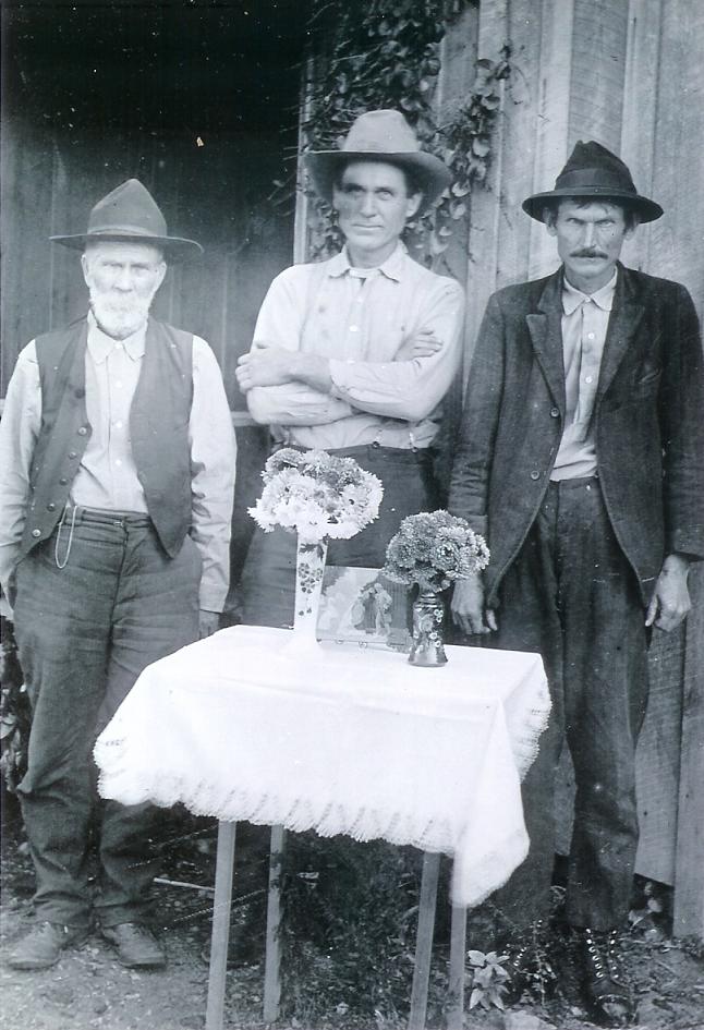 | 3 of the boys of Green Reeves. Left to right: Pleasant Andrew Reeves, Mattison "Matt" Reeves, and Willis Parmer or Palmer Reeves. Pleasant Reeves is the son of Green Reeves and Delilah Unknown, he was born March 04, 1852 in Marion Co, AR and died January 28, 1929 in Cleburne Co, AR. He was married to Sarah Melissa Baker Mattison "Matt" Reeves is the son of Green Reeves and Sintha Sooter, he was born January 22, 1880 in Duff, Searcy Co, AR and died March 09, 1962 in Oklahoma City. He is buried in Byars Cemetery, Byars, McClain Co, Ok. He married Elizabeth Mahaney Bacon on November 01, 1899, in Van Buren Co, Ar. Willis Reeves is the son of Green Reeves and Sintha Sooter, he was born April 09, 1875, Duff, Searcy Co, AR and died October 27, 1938 near Shirley, Van Buren Co, AR. He is buried in Shady Grove Cemetery in Van Buren Co, AR. --Submitted by Linda Maxey Prater | |