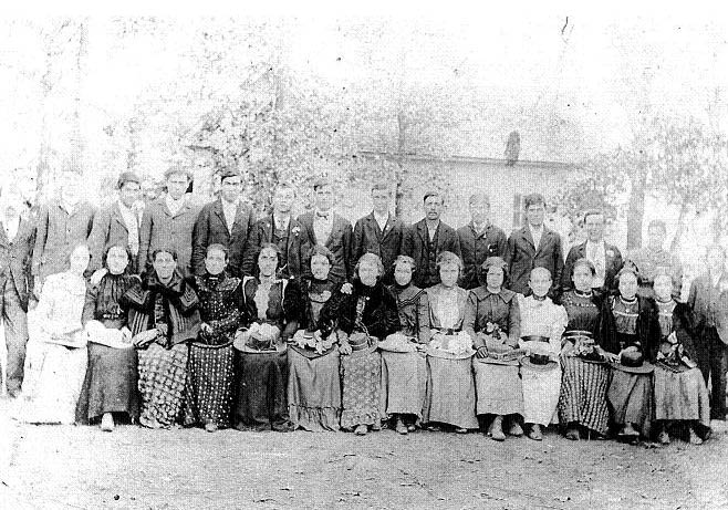 | Savannah Tennessee Robert about 1900 with a group on her baptismal day in Scotland, Arkansas, she is the 4th from the right. -- Submitted by Garry Brewer | |