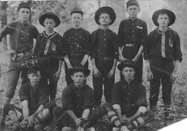| Ball team taken about 1909 around Fairbanks. From right to left the boy on the bottom row sitting down with the ball in his hand is Joseph Hudson. The boy above him is William Addington May. Does anyone know who the other boys are? --Submitted by Alice Burroughs Shipley | |