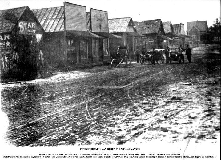 | 1912 Bee Branch This picture was found in the attic of the James Rice Patterson home. Mr. Patterson's home is shown in this picture at the very end of the Street. James Rice Patterson was the County Judge at the time this picture was taken in 1912. This picture came originally from Nadene[Burroughs] Blizzard who is the granddaughter-in-law of James Rice Patterson. Lou Hayden a local resident until the 90's borrowed the picture and had copies made from it and is the person responsible for sharing this original 1912 picture with so many of the towns' people of Bee Branch & Morganton.---Submitted by Vicky Dennis | |