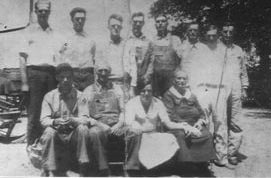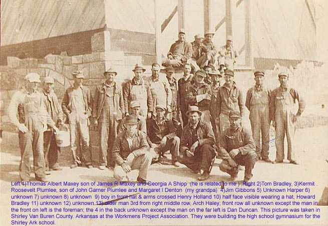 | WPA workers near Shirley Arkansas during the depression era. The latest list of people in the picture: 1) Thomas Albert Maxey son of James R Maxey and Georgia A Shipp 2) waterjack (that is the name for his job ) Tom Bradley 3) Kermit Roosevelt Plumlee son of John Garner Plumlee and Margaret I Denton (and my grandpa) 4) Jim Gibbons 5) Unknown Harper 6) unknown 7) unknown 8) unknown 9) boy in front hat & arms crossed Henry Holland 10) unknown 11) wearing a hat smoking a pipe Howard Bradley 12) older man 3rd from rt middle row Arch Haley, 2nd from right is Columbus Satterfield front row all unknown except the man in the front on left is the foreman. The 4 in the back unknown except the man on the far left is Dan Duncan. This picture was taken in Shirley Van Buren Co Ark the workmens project assoc and they were building the highschool gymnasium for the Shirley Ark school. - Submitted by Genia | |