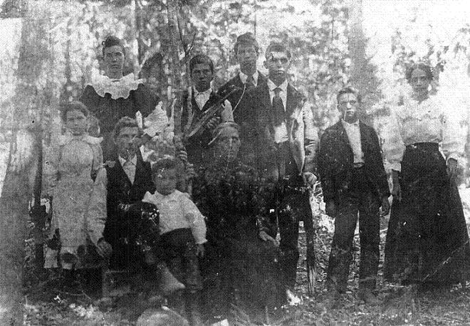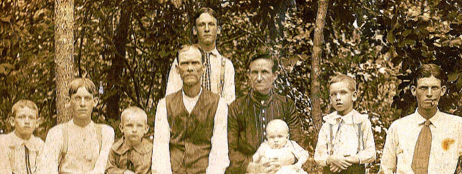 | Burroughs Top left: Charlie Joy, Ola T., Albert, Oscar, Will, JimEd, Tade and Oather. Front row from left: Pete, William Henry, Velie, & Shirlottie. - Submitted by Alice Burroughs Shipley | |