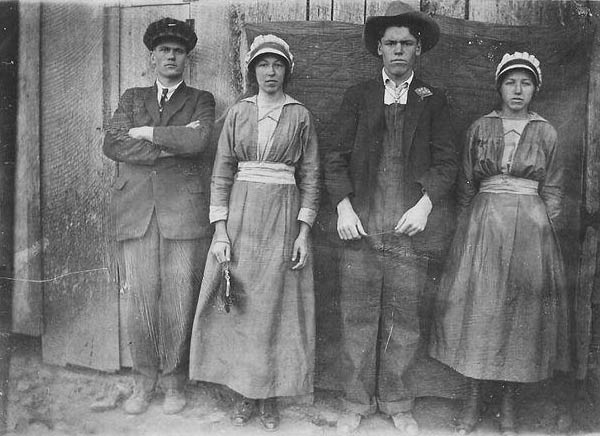 | This is a picture I found in my husbands grandmother's things. On the back it says Bertha Gleen, Lillie Bowling, Joe Gleen, and James Drake. --Submitted by Alice Burroughs Shipley The correct names for Bertha (Eades) Glendenning, Lillie (Eades) Bowling, Joe Glendenning They are my aunts and uncles----Additional information submitted by Donnie | |