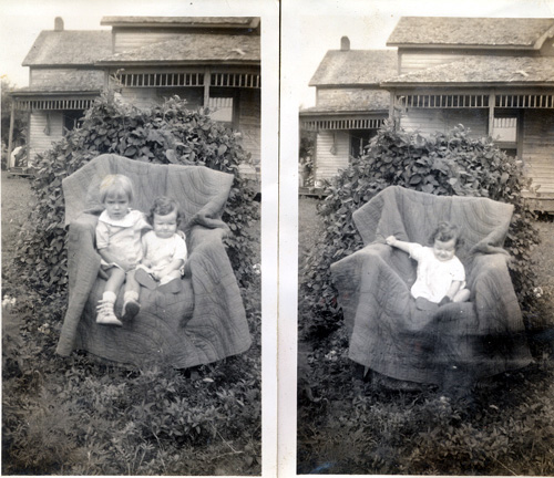 | JoAnn says "This is a picture of Mary and Buddy Bradford's house at Eglantine. (Aunt Mary/Uncle Buddy) It was on the west side of the road going from Shirley to Eglantine. In the first picture, left is Laverne and JoAnn Bradford and right Joann (me) by herself. It was a beautiful old home, too bad it wasn't restored." Submitted by Joann Bradford | |