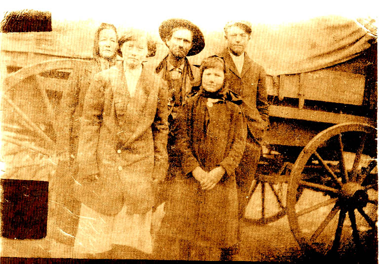 | Mary Elizabeth Brown Shelton, John Shelton and James "Jim" Gibbons, In front are Bessie Laverne and Adele Shelton.. These are my Greatgrandparents. John Shelton and Mary Elizabeth Brown Shelton, with my Grandmother Bessie Shelton, her sister Adele and half brother James Gibbon's. They left Van Buren Co. in that wagon, going to Oklahoma as John Shelton had what was called consumption, which we know as TB. They went to Oklahoma hoping to cure him. I found him in Atoka Co., OK working on a farm in the 1910 census. My grandmother said he was buried in a Redhill Cemetery, but it was a Redden Cemetery near a town called Redden, OK. At least she remembered the red part and she was only 12 years old. I had been looking for him for more than 20 years before I found him. Can you even think about leaving Van Buren Co. which is in North centeral Arkansas, probably crossing the Arkansas River at Ft Smith then going to the SE corner of the state in that wagon?. Click photo for more info. Submitted by Joann Bradford | |