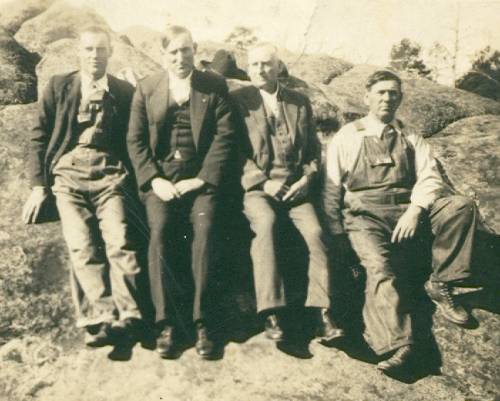 | Made at the "Rock House" in 1941. (Rock House is a landmark located by Morganton, out from Bee Branch) L-R: Ira Mercer (son of Henry & Augustine Mercer), Oathur Risener & Porter Risener (sons of Jim & Cyntha McDaniel Risener) & Richard Brown (son of William & Haley McDaniel Brown). ****Richard was the cousin of Oathur & Porter - their mothers were sisters - & Ira was married to Pearl, the sister of Oathur & Porter.**** --Submitted by Juli Risener Morgan | |