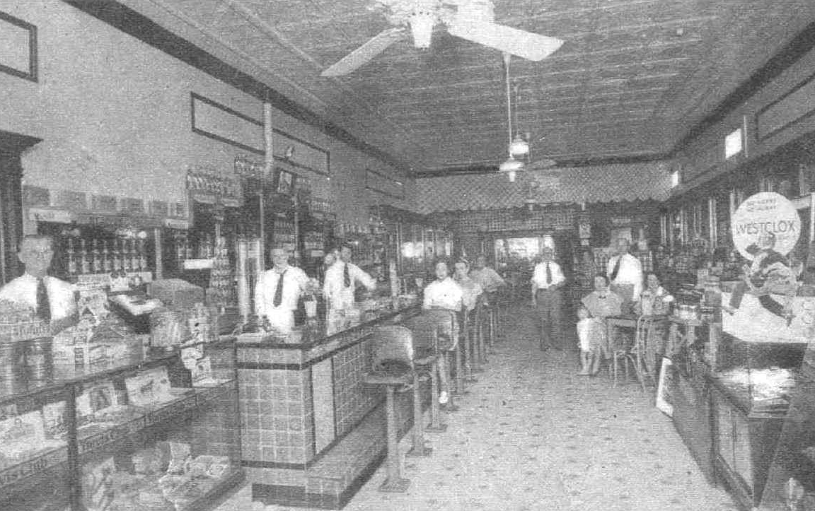 In the soda fountain we offered milk shakes, malted milk, fountain Coca Cola, ice cream sodas in all flavors, phosphates, limeades and a big favorite – Bromo Seltzer that was mixed and consumed at the counter. We also offered ice cream in several flavors in cones or dishes as well as our specialty and moneymaker – hand packed ice cream in one-pint cartons.