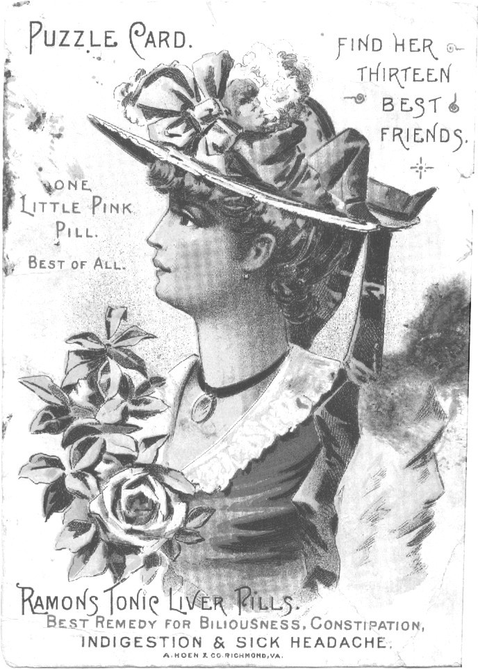 The White County Historical Society thought you might enjoy trying to find this young lady's "best friends". This Victorian-era novelty "Puzzle Card" was distributed as advertising by retailer J.F. Gray of Mt. Pisgah. There are 13 friends hidden in the illustration - although Historical Society archivists say they have never found them all. The advertisement on the back of the card promotes "Dry Good, Notions, Staple Groceries, Hats and Caps, Boots and Shoes, Hardware, China and Glassware, Medicine and all Farm and Household Supplies. Our counters simply sparkle and our choice of Staple Goods and Novelties is always sound. Come and examine our stocks. You will be surprised at the varied assortment we can offer and delighted at the prices. We carry a full line of Ramon Remedies and confidently recommend them to our friends." Did you notice the man reclining on the lady's hat?
