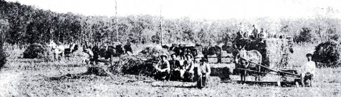 It was common to see peaches and apples drying in the sun on improvised scaffolds made by laying planks across saw horses or on low shed roofs. This process required some three or four days to complete, and the fruit must be brought in each night as the dew would add moisture and cause the fruit to be dark. This preservation method was done without thought of flies or air pollution, but those fried “half-moon” pies was something to remember. On a cold frosty morning when the “signs were right,” several neighbors would butcher their hogs and bring them to our place, where water was plentiful from a shallow well, to scald and scrape the hogs, which required three or four men to handle. Work went on all day and the ladies cooked a feast at the noon hour. When crops were “laid by” in summer, there was a little leisure time before “fodder pulling” and haying time. This provided time for cutting the winter wood for the fireplaces and the wood cook stoves. During this season, on election years especially, all-day picnics were held in shaded areas near small towns with lemonade stands, ice cream and bottled soda water cooled in tubs of floating ice. There were balloons and noise-makers for the “kiddies,” the mule-propelled merry-go-round for the younger set, and all candidates were invited to speak. A baseball game was often an added feature.