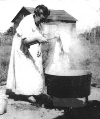 When the water in the pot was hot, she dipped some out into one of the tubs where the clothes were scrubbed on the rub board. They were then put in the wash pot and poked down in the soapy water with a cut-off broom handle to boil. When they had finished boiling, they were rinsed in clear water and then in the bluing water. The white shirts were starched first when the starch was thick; only the collars, cuffs and front facing of the shirt were starched. Then the starch was thinned down before starching the other clothes.