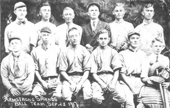 Armstrong Springs Baseball Team, September 23, 1917 – From left: Front row – Roe Killough, Ralph Jarrett, Gus Kitts, Tommy Killough, Sam Sowell, Willis Killough. Back row – Jewell Lytle, W.E. Baker, Paul Jarrett, Walter Lytle, Roy Canfield, Noel Woodson.