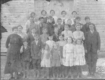 This is Redus School c1915. Most of the children are holding small American flags and there appears to be snow on the ground. Shown are (from left): Front row - Annie Crook, S.D. Armstrong, Hugh Haynes, Ann Wormeline, Iramae Satterlee, Ollie Gann, Myrtle Gann; second row - Floy Haynes, Blanch Maddox; third row - Leah Dobbins, Hugh Haynes, Emol Hart, Golden Aunspaugh, Ruby Aunspaugh, N. Armstrong, teacher Henry Neal; fourth row - B. Gilliam, Roy Gilliam, Paul Armstrong, Lloyd Gann, Eugene Hart, Sam Sowell, Arlie Greer; back row - Mary Armstrong, Lerlie Haynes, Myrtle Maddox, Alta Hart and Euna Dobbins. The Annie Crook on the left side, dark dress, went on to marry the school teacher, Henry Neal, and she and her husband established "The Ideal Shop," a ladies clothing store in Searcy, and operated it for many years. According to Mildred Staerkel of Sherwood, who provided the photograph and who is the daughter of Mary Armstrong on the back row, said that Ann Wormeline, the little girl on the front row, was a visitor at the school: “She and her parents stayed in one of the cottages near the Armstrong Spring; it was customary for children to attend the school when it was in session during the summer. I did that myself when I went up there in the summer – not for more than a few days, though.” Armstrong Springs is featured in the 2003 edition of White County Heritage.
