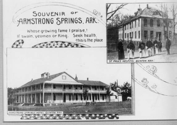 This souvenir postcard c1912 features the hotel and hospital at the health resort and recreation area west of Searcy. The White County Historical Society is researching this unique landmark for a future edition of White County Heritage, the annual historical publication. If you have information or photos on the Armstrong family or Armstrong Springs, you are invited to contact the Society at P.O. Box 537, Searcy, AR 72145 or wchistory@sbcglobal.net