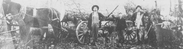 The timber industry has been enormously important to the settlement and growth of White County. These log haulers pose for a family portrait (two men, two women, two boys and a girl) in the woods at Tyler, Arkansas, in 1917. They were headed for Doniphan Lumber Company and are carrying a log that appears to have come from a huge pine tree. Can you imagine handling such a load by hand? The man in the middle is leaning proudly on the crosscut saw that probably did the job.