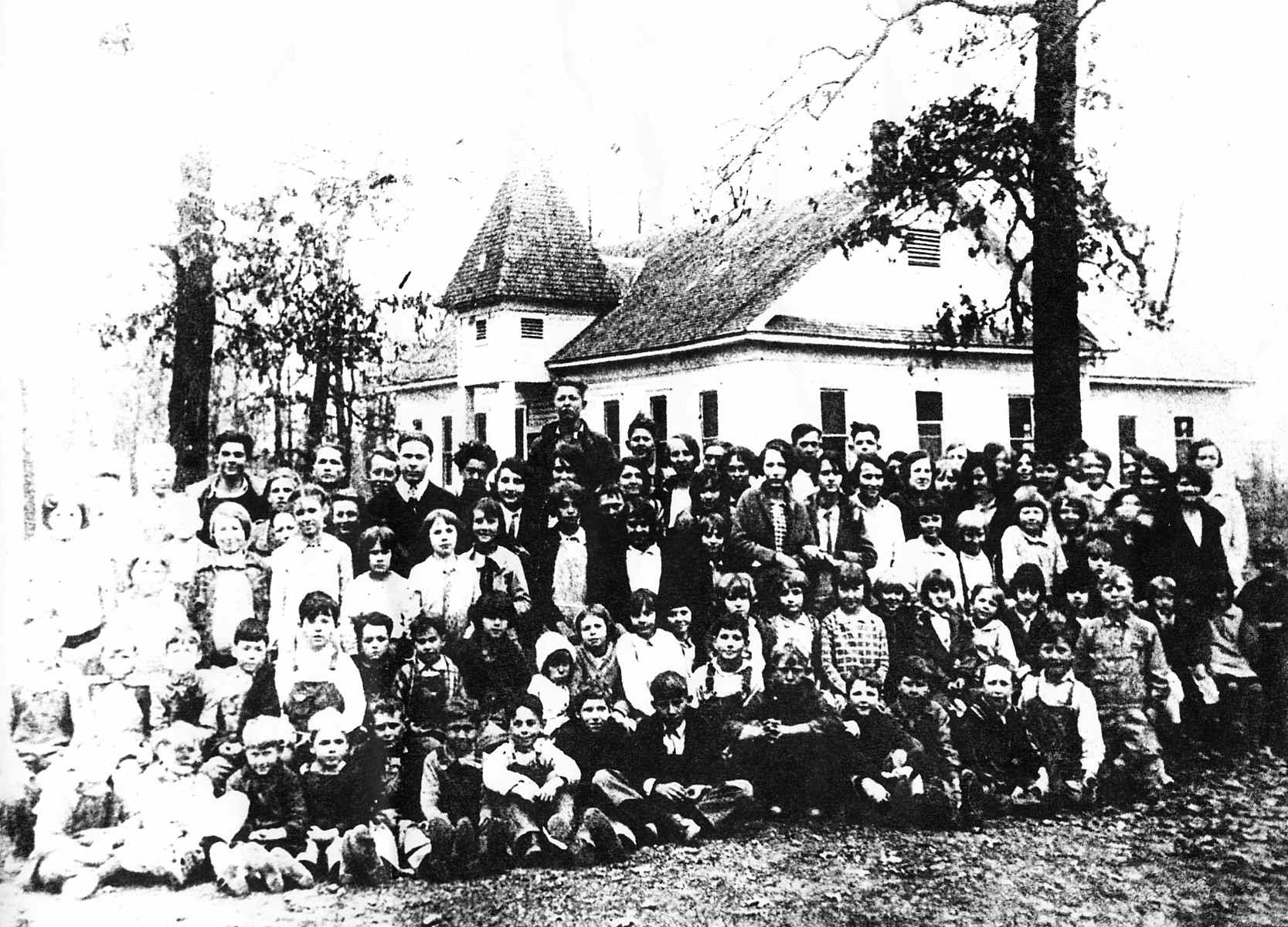 This is Four-Mile Hill School in 1928 or ’29. The known students are Jim Finch (second row kneeling, behind the boy with a white shirt and overalls), Lillian “Sue” Brown (third row, seventh from left, in white dress) and her sister Lois Brown (sixth from left on the top row). Sue Brown married Joe Black from Crosby, and Lois Brown married Sidney Smith.