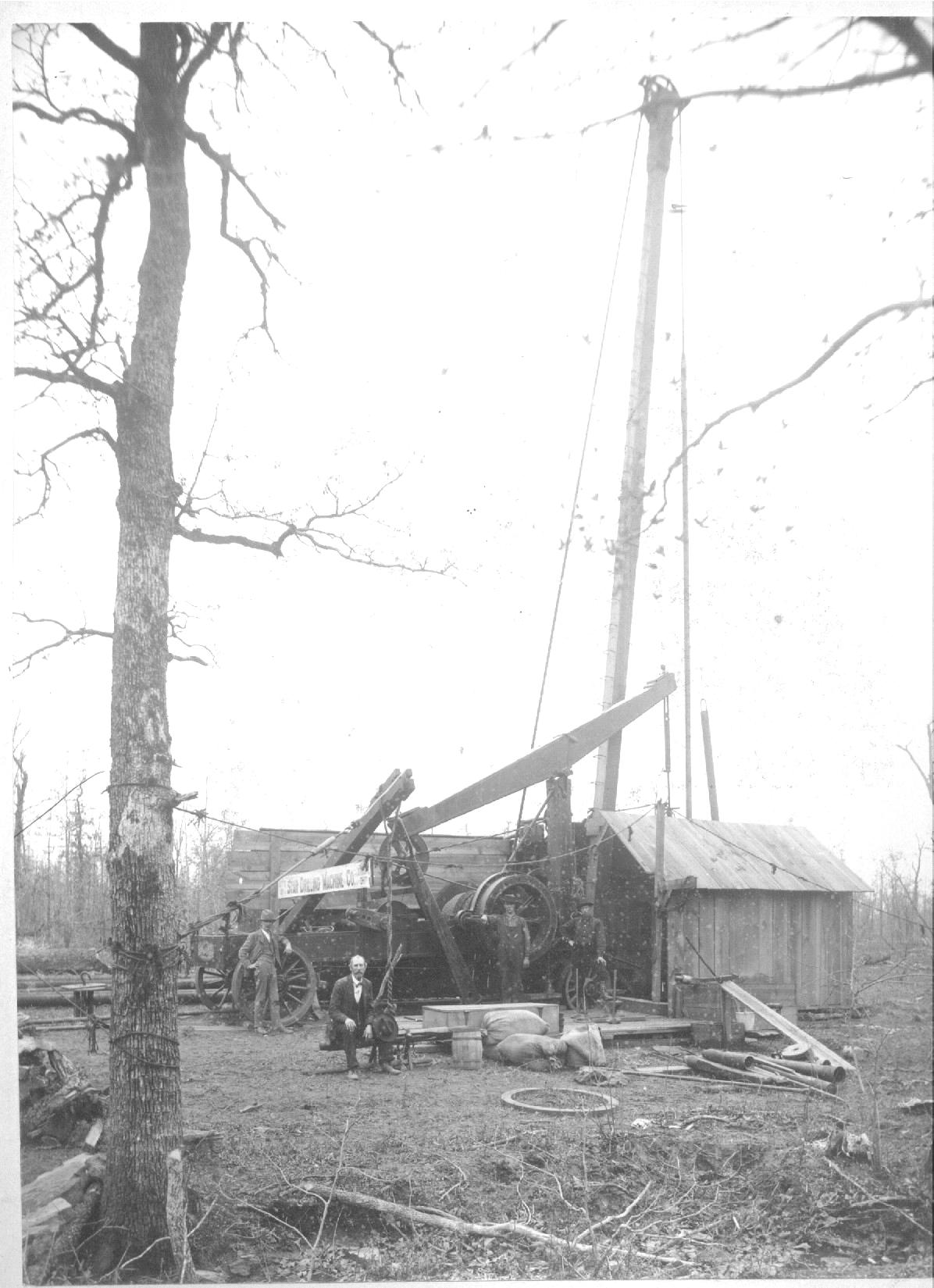 White County Oil Well, Four-Mile Hill. This is believed to be the first oil test well drilled in White County. It was about a mile and a half northwest of the point where Highway 16 passes over Four-Mile Hill, northwest of Searcy. The sign on the rig indicates that it belonged to the Star Drilling Company. The well was probably rather shallow. It was in or near what was for many years known as the Sliter Field. There are three men in the background who are not easily visible in the photo. Identities and the date are unknown. Courtesy Ivan Quattlebaum, White County Historical Society, from the scrapbook owned by Society member Oran Vaughan and started by J.F. Fisk.