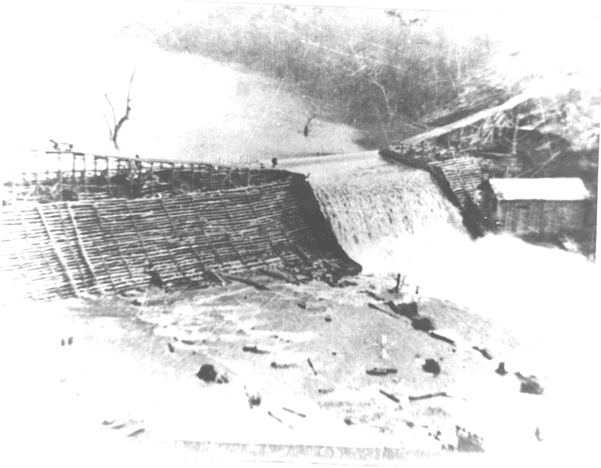 Hiram, which was once a part of White County, was the location of this dam on Big Creek in 1927. The hydroelectric dam was built at the base of Hiram Bluff, creating great promise for residents of the area. The excitement was short lived, however, because the dam was carried away by a flood just months after its completion. Hiram is located two miles north of Pangburn and is now in Cleburne County. Photo courtesy Teresa Hayes Phillips and the White County Historical Society.