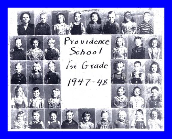 This is Mrs. Nannie Galloway’s First Grade Class of 1947-48 at Providence School. Shown are (left to right, beginning at the top row and going down): Mrs. Galloway, Rayford Davis, Darlene Hendrickson, Louis Cooper, JoAnn Finley, Sam Womack, Mary Helen Little, Johnnie Ray Pickens; second row - Darrell Hart, Kathleen Kitty, Roy Afton Watkins, Barbara Sterling, Teena Sumpter, Joan Ellis; third row – Larry Gentry, Phyllis Smith, Ray Sterling, Glenda Figgins, Neil Windland, Glenda Sterling; fourth row – Adele Brewer, Charles King, Freda McAdams, Aretha Ferren, Joyce Jones, Floyd Watkins; bottom row – Maxine Mason, Herndon Ray Chapman, Karen Stewart, Johnnie McAdams, Piney Miller, James W. "J.W." Amyett, Barbara Shrand, Cecil Ray Davis and Zelma Ferrin. Not shown: Frank Stewart. Mary Helen Little in the top row is a descendent of Elijah Little, founder of the Providence community.