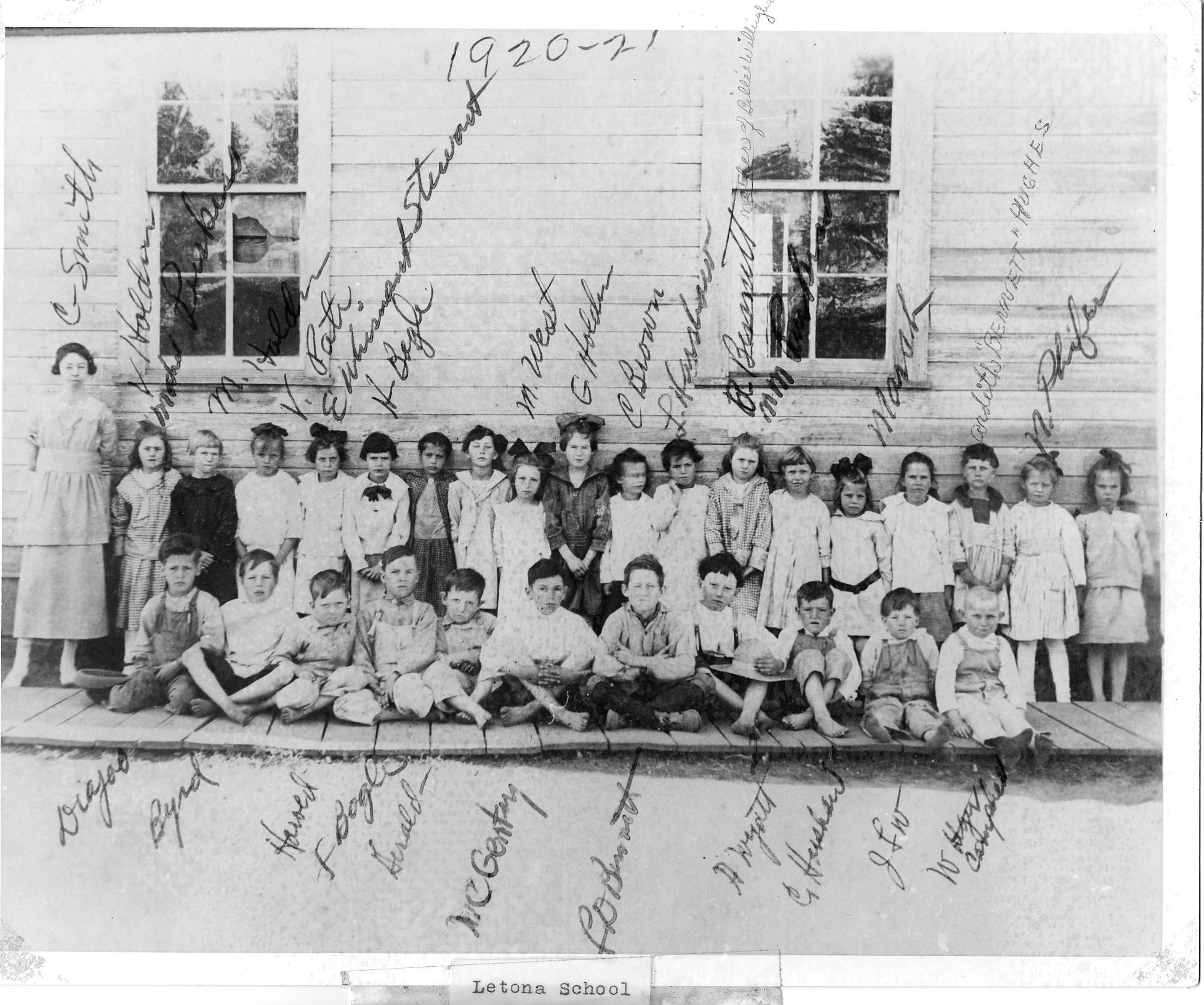 Letona School is shown during the 1920-21 term and the students are identified by names written directly on the print. The handwriting is different for each name. Perhaps it was autographs by the students at a reunion of the school many years later.