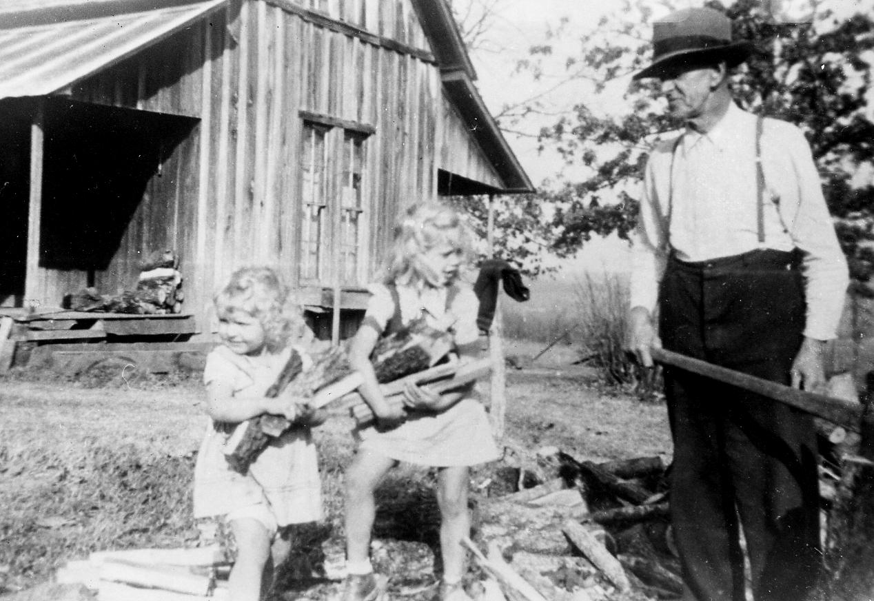 The daughters of Chester Whisnant help their great-uncle Milam Harrison carry firewood at the George Whisnant home near Mt. Pisgah, c1935. Milam was the uncle of George and Chester and lived at Pickens Chapel.