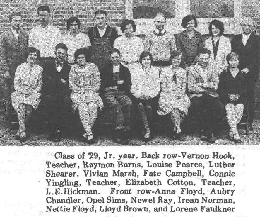 Class of '29, Jr. year. Back row- Vernon Hook, Teacher Raymon Burns, Louise Pearce, Luther Shearer, Vivian Marsh, Fate Campbell, Connie Yingling, Teacher, Elizabeth Cotton, Teacher, L. E. Hickman. Front row - Anna Floyd, Aubrey Chandler, Opel Sims, Newel Ray, Irean Norman, Nettie Floyd, Lloyd Brown, and Lorene Faulkner.