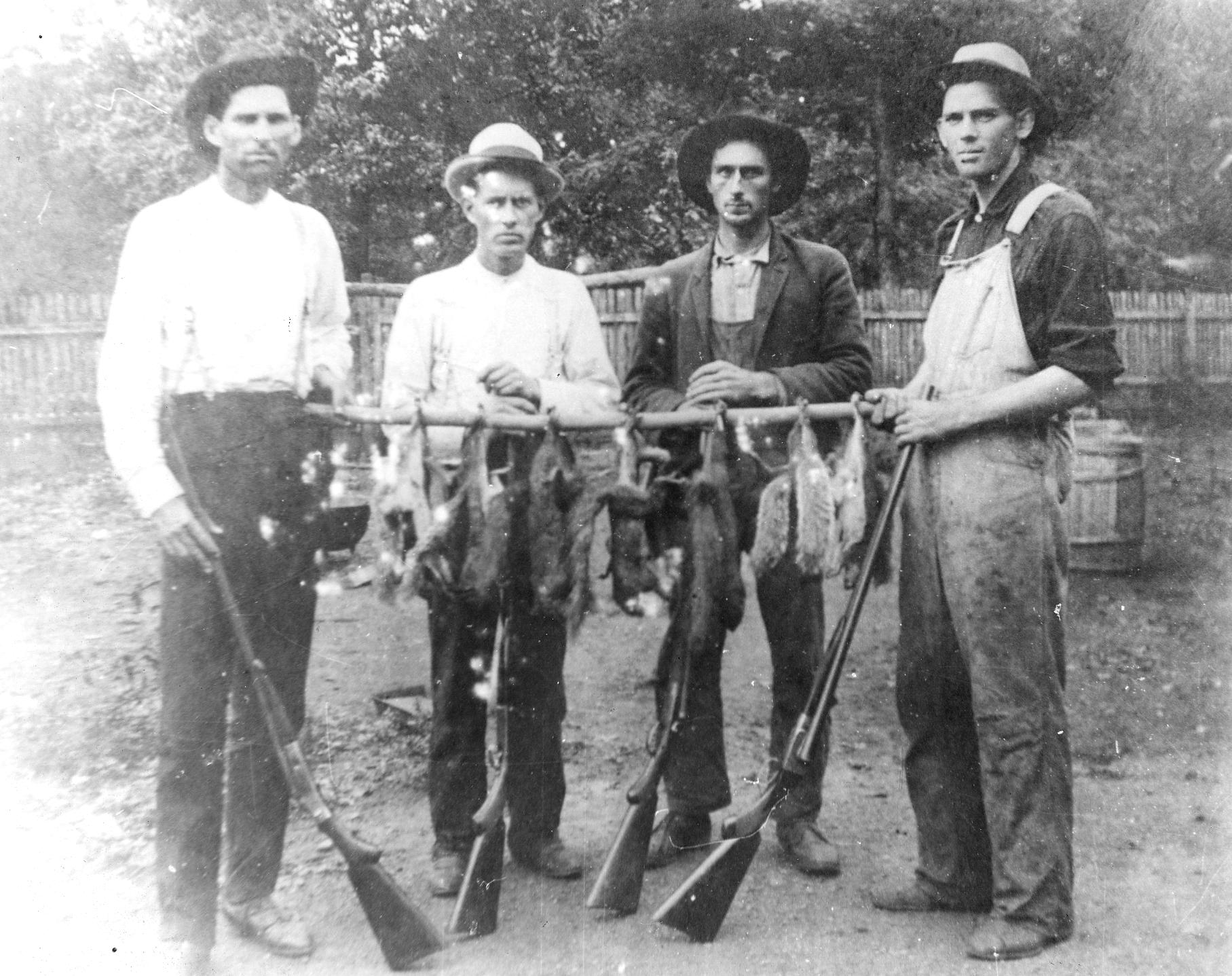 Who needs camouflage? These Pickens Chapel squirrel hunters didn’t have any, and they still had a successful day. It’s hard to tell if they’re proudest of the squirrels they killed or the guns they owned. Shown (left to right) are Edgar Whisnant, Jim Bunch, Auther Clay and Bruce Whisnant. Bruce and Edgar were brothers and Jim married their sister Magie. Authur was brother-in-law of Richard Bennett, grandfather of Billie Willingham who donated the picture. The date of this photograph is uncertain, but Edgar Whisnant died in 1922.