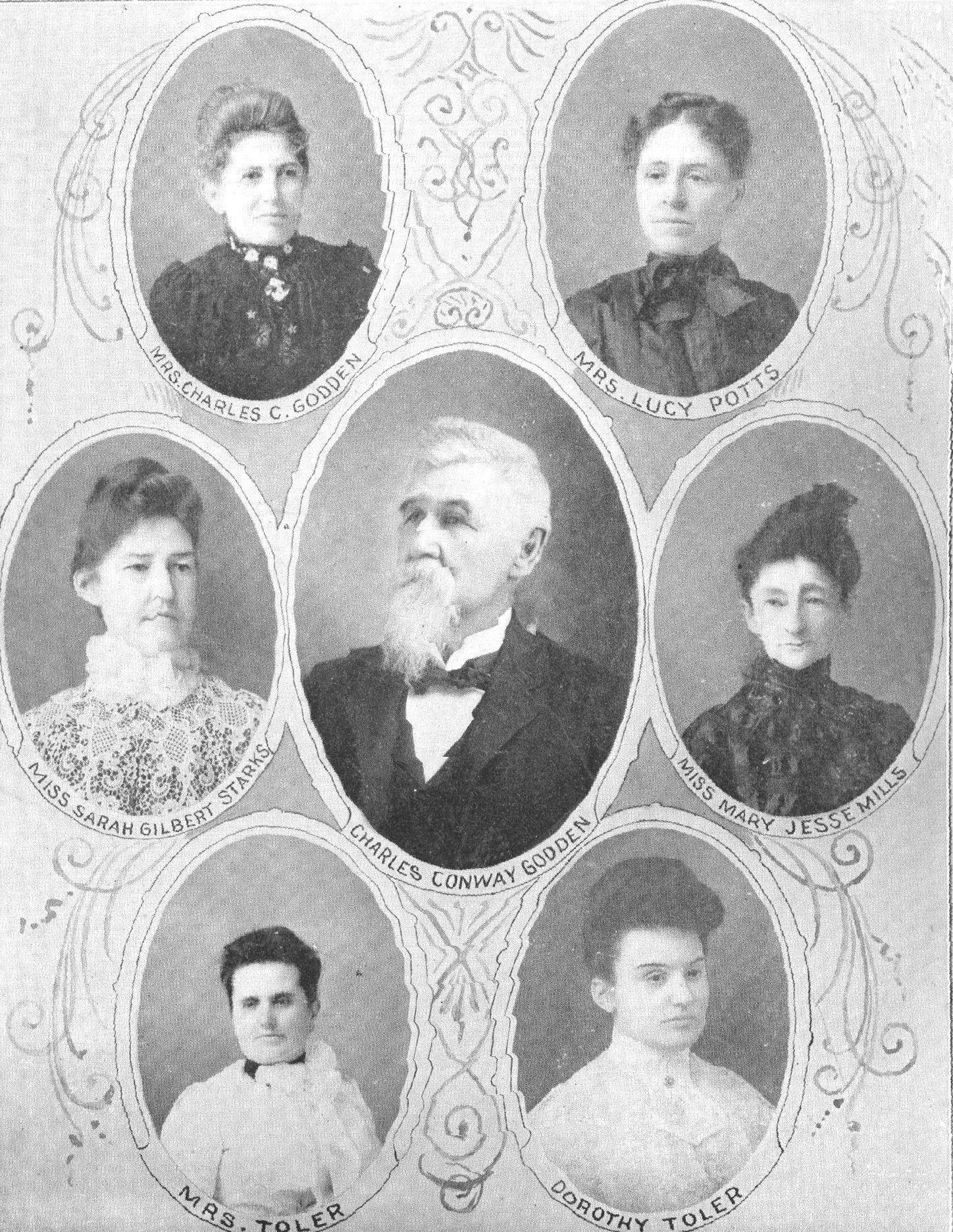 Galloway College president Charles Conway Godden is shown with Mrs. Godden, Mrs. Lucy Potts, Miss Mary Jesse Mills, Dorothy Toler, Mrs. Toler and Miss Sarah Gilbert Starks, from a yearbook in early 1900. Courtesy Ivan Quattlebaum, White County Historical Society.